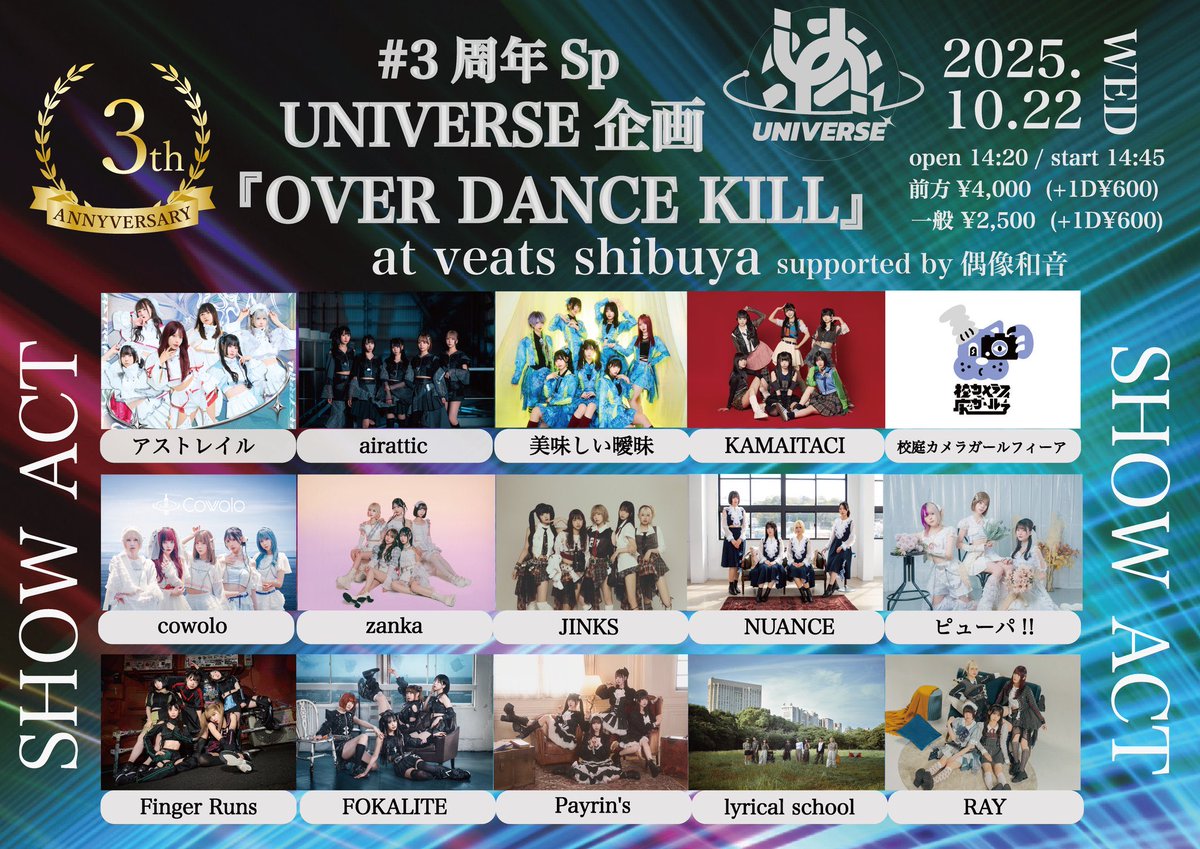 🪩来週出演!🪩 / UNIVERSE 企画 # 3周年sp @ supported by偶像和音 『OVER DANCE KILL』 #lyricalschool 出演!🪩 \ 🗓️10月22日(水) ⏰open 14:20 / start 14:45 📍veats shibuya #リリスク ライブ🎤16:30〜 特典会🫶17:05〜 🎫前方¥4,000/一般 ¥2,500 (+1drink¥600) http://t.livepocket.jp/e/5yfbf