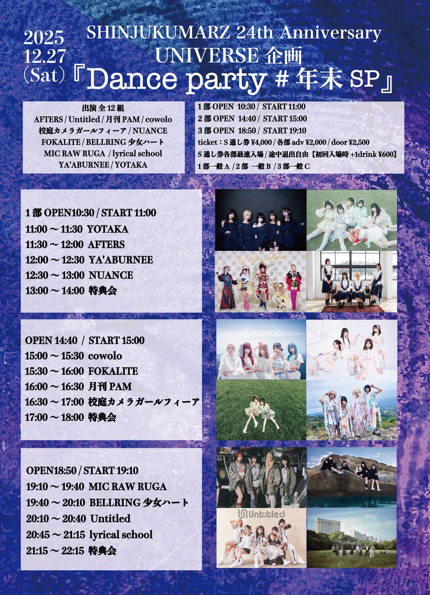 💥本日は2025年ラストライブ!💥 / SHINJUKUMARZ 24th Anniversary UNIVERSE企画『Dance party #年末SP』 3部に #lyricalschool 出演! \ 🗓️12月27日(土) 📍新宿MARZ #リリスク ライブ🎤20:45〜 各部前売¥2,000 ✅3部の前売チケット販売中! 🎫http://t.livepocket.jp/e/z117m
