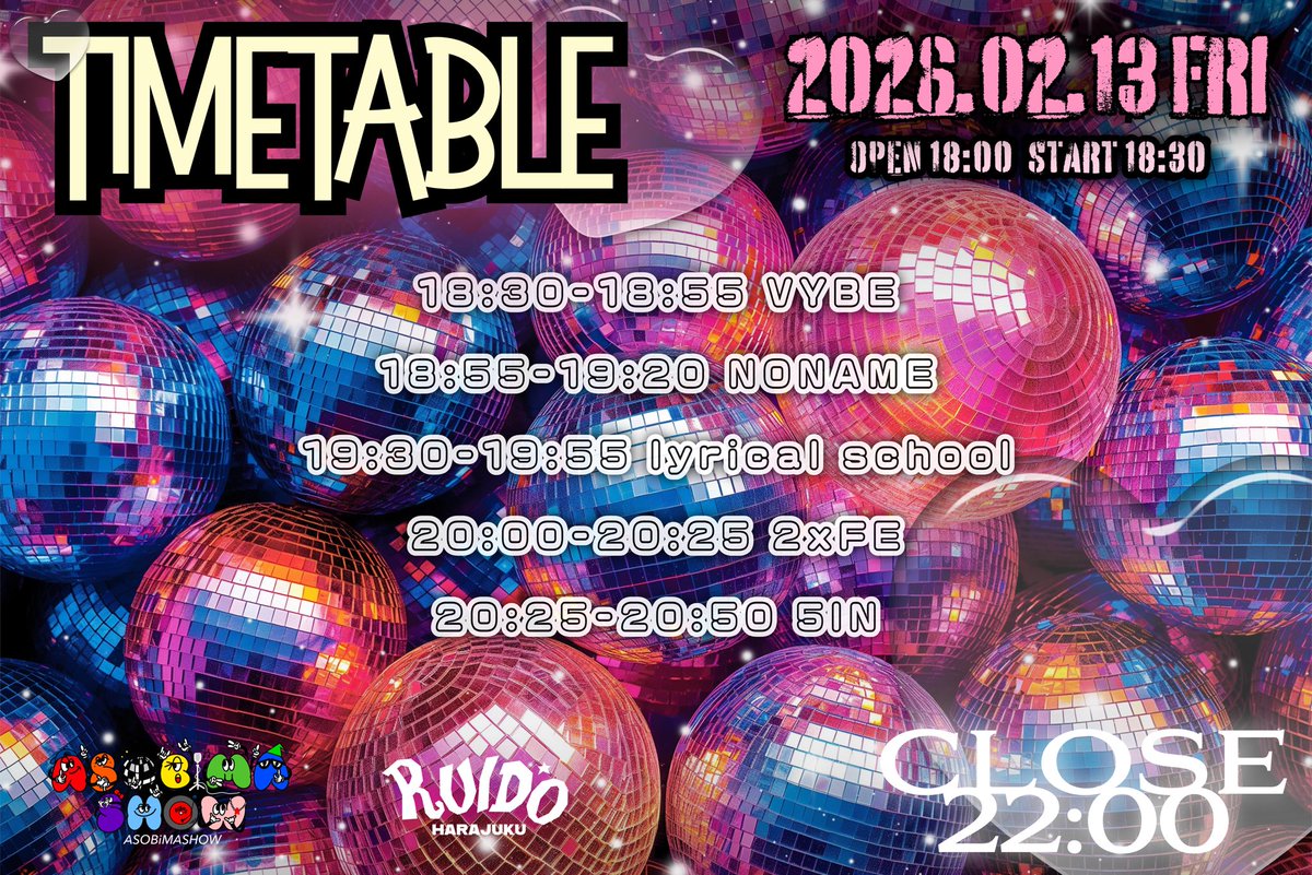 \\🎙️🕺タイムテーブル公開🍫🪩// 🏃♂️ チケット販売は本日23:59迄💨 🎫:http://tiget.net/events/455447 2/13(金) 原宿RUIDO presents. ASOBiMASHOW #56 ~Valentine the dance vocal night 2026~ ACT🔻 5IN N0NAME lyrical school VYBE 2xFE ⏰OPEN/START 18:00 / 18:30 🚪ADV/DOOR