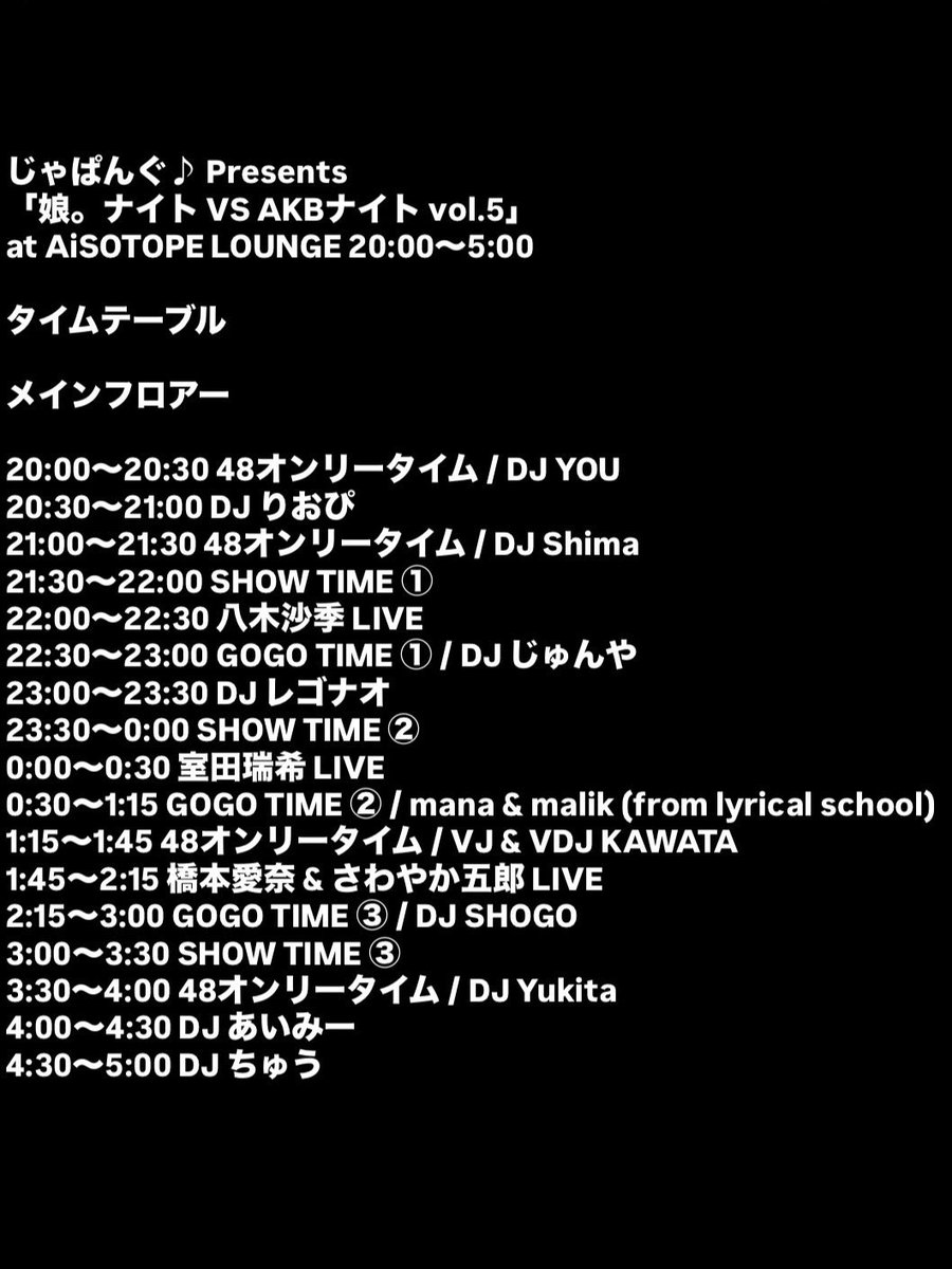 🆕新規イベント情報解禁! 2026年2月20日(金) じゃぱんぐ♪ Presents 「娘。ナイト VS AKBナイト vol.5」 @AiSOTOPE_LOUNGE 20:00~5:00 料金:一般 3800円/1D付 X リポスト ディスカウント 3300円/1D付 遅割 2時以降入場 2500円/1D付 CAST 🎤GUEST LIVE 室田瑞希/八木沙季/橋本愛奈/さわやか五郎