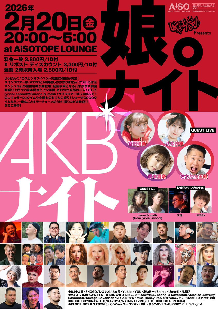 [Xリポスト対象ポスト] 2026年2月20日(金) じゃぱんぐ♪ Presents 「娘。ナイト VS AKBナイト vol.5」 @AiSOTOPE_LOUNGE 20:00~5:00 料金:一般 3800円/1D付 👑スペシャルゲスト👑 室田瑞希 @mizukimurota_ 八木沙季 @sakipyon31 橋本愛奈 @aitune84 さわやか五郎 @sawayakagoro mana
